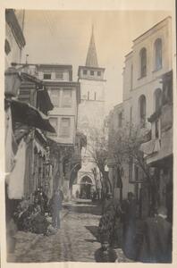Depicts the city street and probably a religious building with local groups of people. No caption.