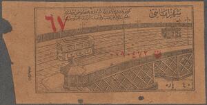 Probably for a tram and depicts an illustration of the trams. Arabic script (presumably Ottoman Turkish). No caption.