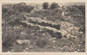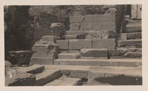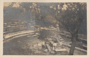 Depicts the ruins, probably at Orthia, near Sparta. There are also two people on the photograph, but are impossible to identify. Handwritten captions: “Theatre" and "WL”.