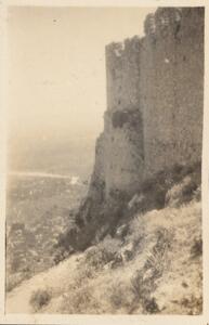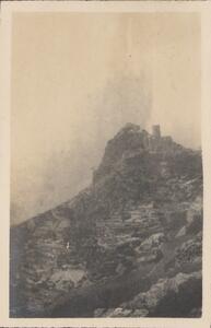 Depicts the ruins of a castle? at Mystras. Handwritten caption “Mistra”.