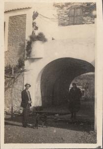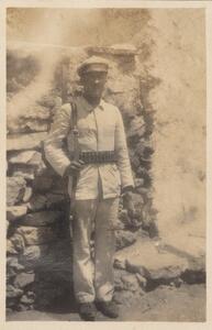 Depicts an armed man, probably called Κασιμης outside a building, probably near Marmari. Handwritten caption “Our host Κασιμης”.
