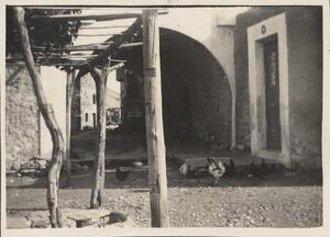Depicts the outside of a building with chickens. Handwritten captions: “26-27 IV 24." and "Gerolimeni”.