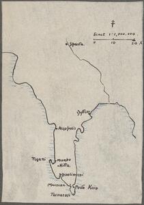 Hand drawn map with the following locations marked: (North to South) Sparta, Gythion, Acropolis, Tigani, Mesapo, Kitta, Gerolimeni, Marmari, Porto Kaio and Tainaron. Marked "SCALE 1:1,000,000" Probably of the route she did.