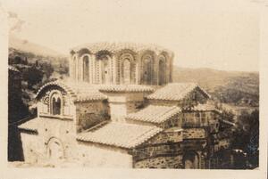 Depicts the church of Agia Sophia at Mystras. Handwritten captions: “Mistra." and "8.V.24. WL.”