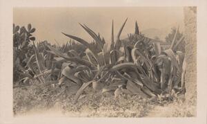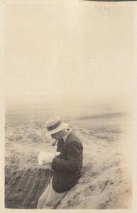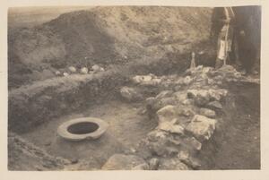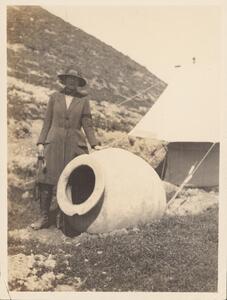Depicts Winifred Lamb with a large pot at the excavation site. No caption. This photgraph is no longer glued into the album.