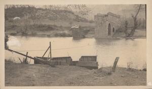 Depicts the remains of a bridge and a boat in an unknown location in Greece. No caption.