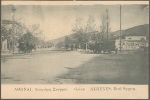 Print (commercial) showing one of the streets (Sygrou Avenue) of Athens. Written on the postcard is “ΑΘΗΝΑΙ. Λεωφορος Συγγρου. Grèce ATHÈNES. Boul Sygros”.