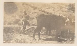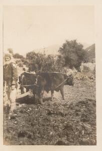 Depicts farmer ploughing at an unknown location in Greece. No caption.