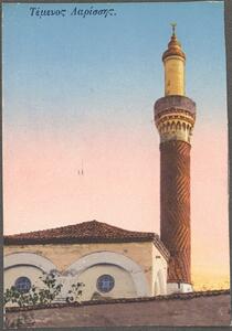 Print (commercial) showing the minaret of the building in colour. Written on the top of the photograph is “Τεμενος Λαρισσης” (Larissa Mosque). Greek name: Γενί Τζαμί Λάρισας.