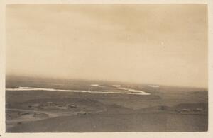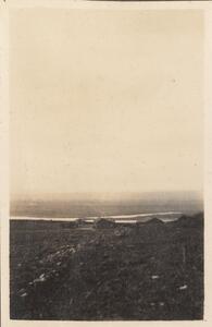 Depicts view of the Vardar River from the mound they are working at North Macedonia. Handwritten caption “The Vardar from the mound”.