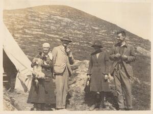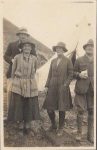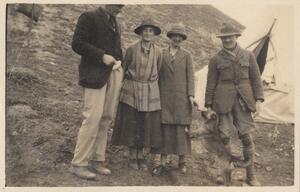 Depicts Eileen and Walter Heurtley, William Cuttle, Winifred Lamb and Kiskim the dog at the excavation site. No caption.