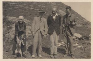 Depicts Eileen Heurtley, William Cuttle, Winifred Lamb and Harold Hush Keen, with Kiskim the dog at the excavation site. No caption.