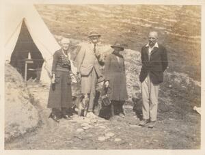 Depicts Walter and Eileen Heurtley, William Cuttle and Harold Hush Keen, with Kiskim the dog at the excavation site of North Macedonia. Handwritten caption under each person “EH. WC WH H.K.”