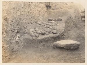 Depicts some pots at the excavation site at Vardarovca. Handwritten caption: “Table. Trench A. Pithios in house.”