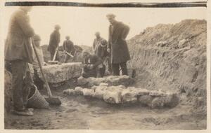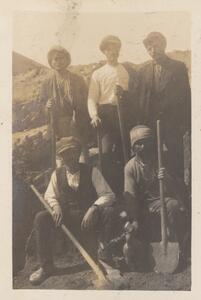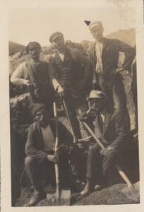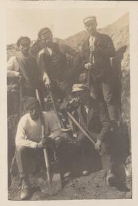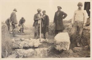 Depicts men excavating at the Toumba of Vardarovca. Handwritten caption “Toumba”.