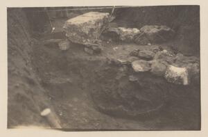 Depicts the excavation with some objects underground at the Toumba of Vardarovca. Handwritten caption “The Toumba. Tunik. 3 III 25”.