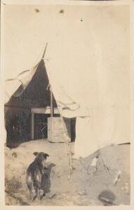 Depicts the dog and the Mess Tent of the excavation at Vardarovca. Handwritten caption: “Kiskim and the Mess Tent”.