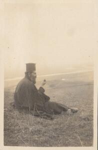 Depicts an orthodox priest near the excavation site at Vardarovca. Handwritten caption: "Sunday Afternoon."