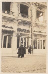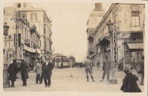 Depicts the Eleftherias (Ελευθερίας) Square (previously named Plateia Olympou (Ολυμπου) until 1908 and before that Plateia Apovathras (Αποβαθρας)). On the right side of the main street in the photo (Venizelos Street) is Café Crystal (καφεζυθοπωλειο κρυσταλ), later Café Poseidon (καφε Ποσειδων), which were at the bottom of the Grand Hotel d’Anglaterre (Μεγαλο Ξεωοδοχειο της Αγγλιας). That Café Crystal was known to be the gathering place for the ‘Liberal Club’ associated with Venizelos’ Liberal Party. On the left side of the main street is the corner of the first building of the Hotel Olympos (Palace) and the building next to it was the Hotel Rome, the bottom of which housed the then famous Café Flokas (Φλοκας) known to many foreigners and probably the destination of Winifred Lamb. Handwritten captions under photograph: “Flokas” on left and “P.O.” on right. At the top right corner of the page is written “March 18-22”