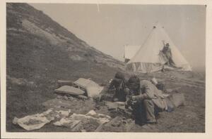 Depicts the tents of the BSA group at the Vardarovca excavation. Handwritten caption: “K & C’s tent. H’s tent. D’s tent.”
