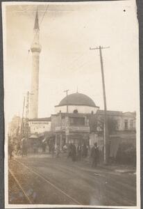 Depicts the mosque at Venizelos street in Thessaloniki, with local people and shops around. Handwritten caption “Venizelos Street Mosque”.