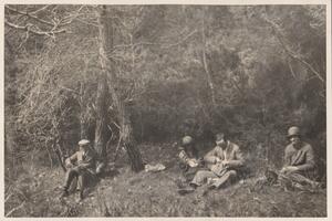 Depicts Francis B. Welch, Vivian Whitfield, Mr. C. Hignett and Elaine Tankard at Stamata Gorge, eating breakfast. Handwritten caption “Stamata Gorge Breakfast” and, under each person, “FBW, V. Whitfield, Hignett, E Tankard”. At the top right corner of the page is written “5th April 1925”. Enlarged version of LAM/3/1/8/41.