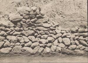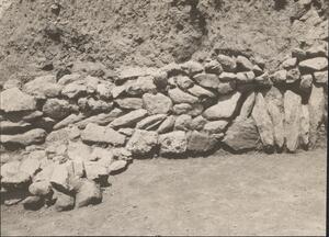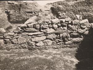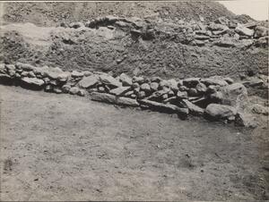 Depicts the remaining of a building at the excavation at Thermi. Handwritten caption “Wall in E”