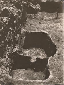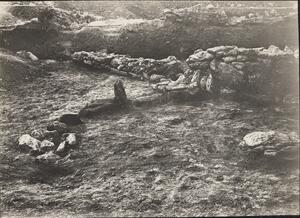 Depicts the remaining of a basin made of stone at the excavation at Thermi. Handwritten caption “Stonebassin in E. photo II (same as I)”
