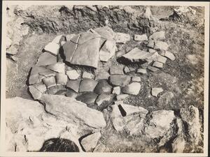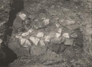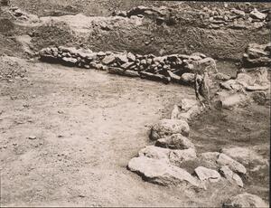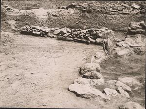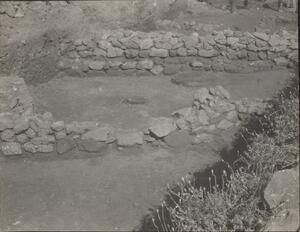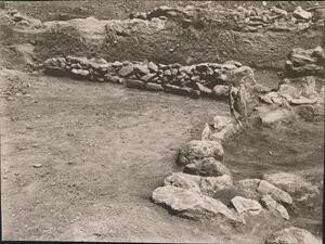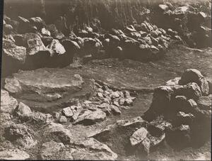 Depicts the remaining of a building at the excavation at Thermi. Handwritten caption “hearth in E corner of E with groove (photo Q)”