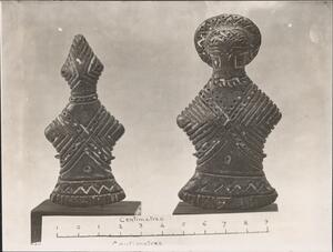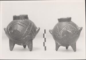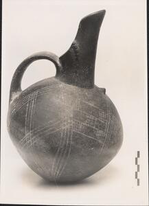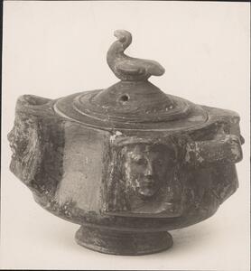 Depicts unidentified ceramic vessel with anthropomorphic features. Annotated reverse.