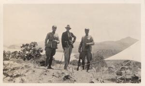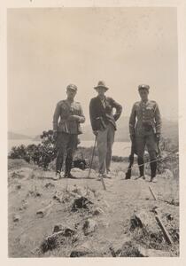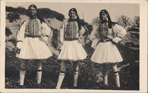 Print (commercial) depicting three evzones, with their costume. At the back is written by Winifred Lamb. “15 VII 33 How do you like the greek kilt as compared with the Scotch one? This is the uniform of a famous regiment. W.L.”. It was sent to J. Ferguson.