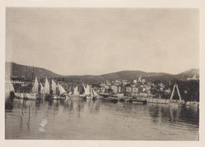 Depicts a boat at the sea, with some smaller boats around. No caption.