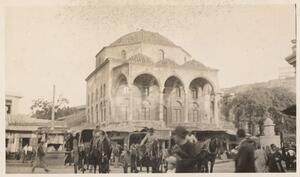 Depicts the square of Monastiraki and the Tzisdarakis Mosque. No caption. Helen Waterhouse wrote “Monasteraki” under the photograph.