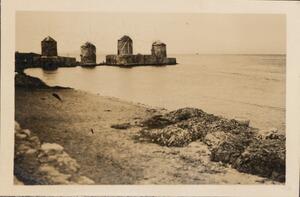 Depicts the windmills of the town of Chios, and the sea. No caption.