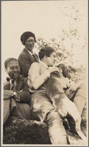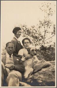 Depicts Winifred Lamb, James Brock, Nine Six and a dog posing and smiling. No caption. Helen Waterhouse wrote their initials next to each one of them.