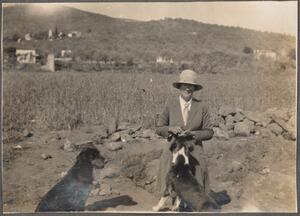 Depicts Winifred with two dogs, probably feeding them. Handwritten caption “Cupboard Love”.