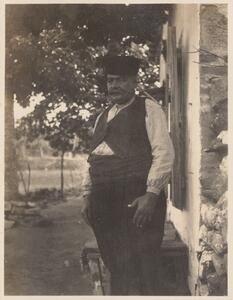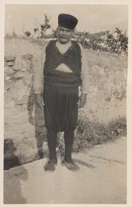 Depicts the man, standing at the street, with traditional clothes. Handwritten caption “The Bright and Shining Joy. Charalambos”.