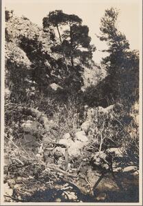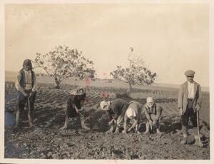 Depicts a group of people, probably some of them are workmen of the dig. Winifred Lamb is there, as well as Richard Wyatt Hutchinson, according to what Helen Waterhouse has written in one of the sides of the photograph. Handwritten caption: “The Holy Akindunoi”.