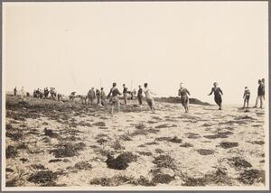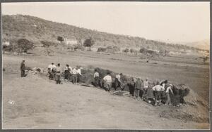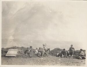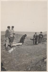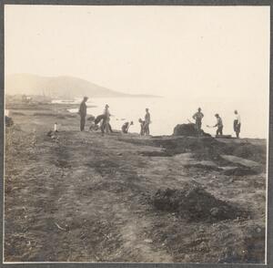 Depicts the workmen at the dig of Thermi (Lesvos). Handwritten caption “'The end of a perfect dig.' Filling in.”