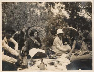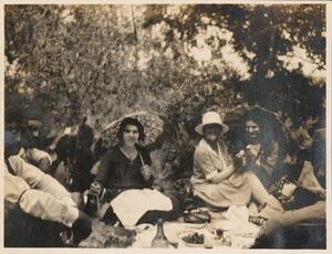 Depicts a group of people (at least 3 women), having a picnic. No caption.