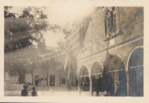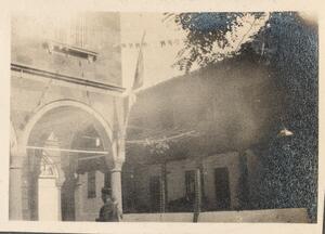 Depicts one of the sides of the religious building at Mantamados, Lesvos. Handwritten caption “The church of the Taxiarch. Mandamadas”.