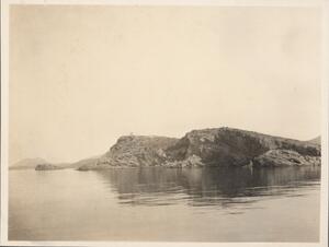 Depicts the view of the sea, with some cliffs, probably near Mitilini. No caption.