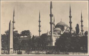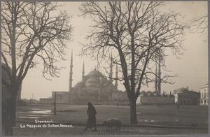Print (commercial) depicting the mosque of the Sultan Ahmed at Istanbul, with a woman and a sheep walking by. Typed on the postcard is “Stamboul. La Mosquée de Sultan Ahmed”. No handwritten caption.