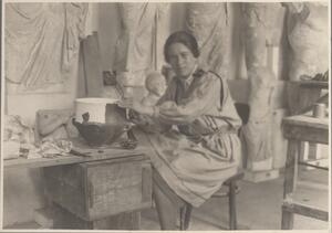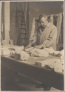 Depicts her restoring a stone bowl, probably at the Fitzwilliam Museum, in 1936. No caption. Helen Waterhouse wrote “Nina Six”.
