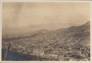 Depicts the view of a harbour, far away. Probably Mitilini. No caption.