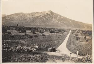 Depicts the landscape, with the fields, a road with a car and the mountain at the background. No caption.