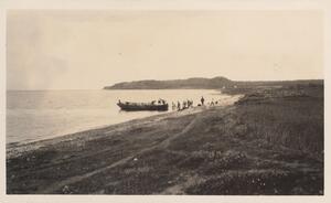 Depicts a boat at the seaside from afar and a group of people, probably unloading the materials. No caption.