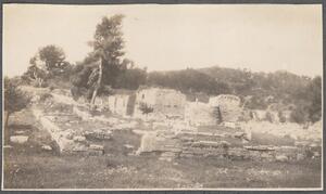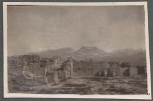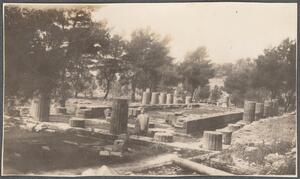 Depicts the ruins at Olympia of a church and the workshop of Phridios. Handwritten caption “Byzantine church. Workshop of Phridios etc”.