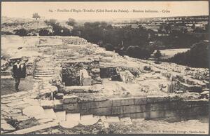 Print (commercial) showing the ruins of the Hagia Triada and an unidentified man, with “64.- Fouilles d’Hagia-Triada (Côté Nord du Palais). – Mission italienne. – Crète” typed at the top of the image. Handwritten caption “Hagia Triada” by Lamb below the image.