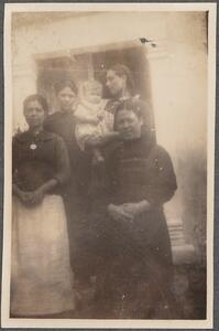 Depicts the prim sisters, a group of four women and a child, Greek local people. Handwritten caption “Vori – the Prim Sisters”.